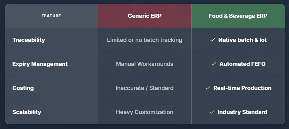 Generic systems were not built to handle perishability, compliance, and production complexity.